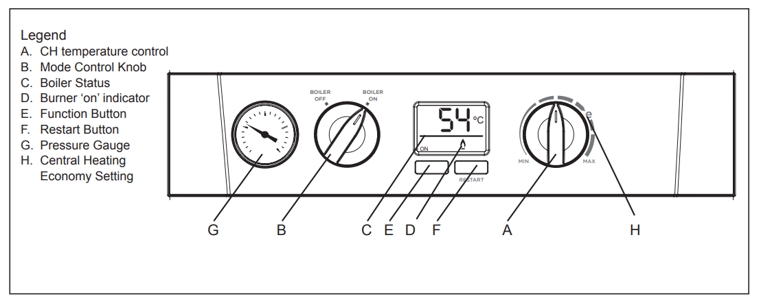 To help your boiler operate more efficiently when the weather is better, move the central heating temperature knob (A) to the ‘e‘ position or lower. When you need your boiler to provide more heat during winter, simply turn the knob towards the ‘MAX’ setting.