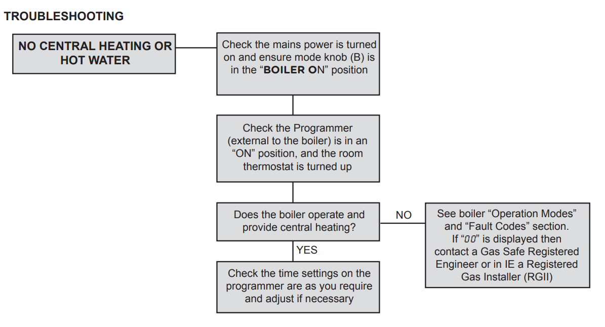 If your boiler stops providing the central heating or hot water you need, the table below contains steps that can be taken to resolve possible causes of the problem. To learn more take a look at page 5 of the PDF user guide, which you can download on this page.