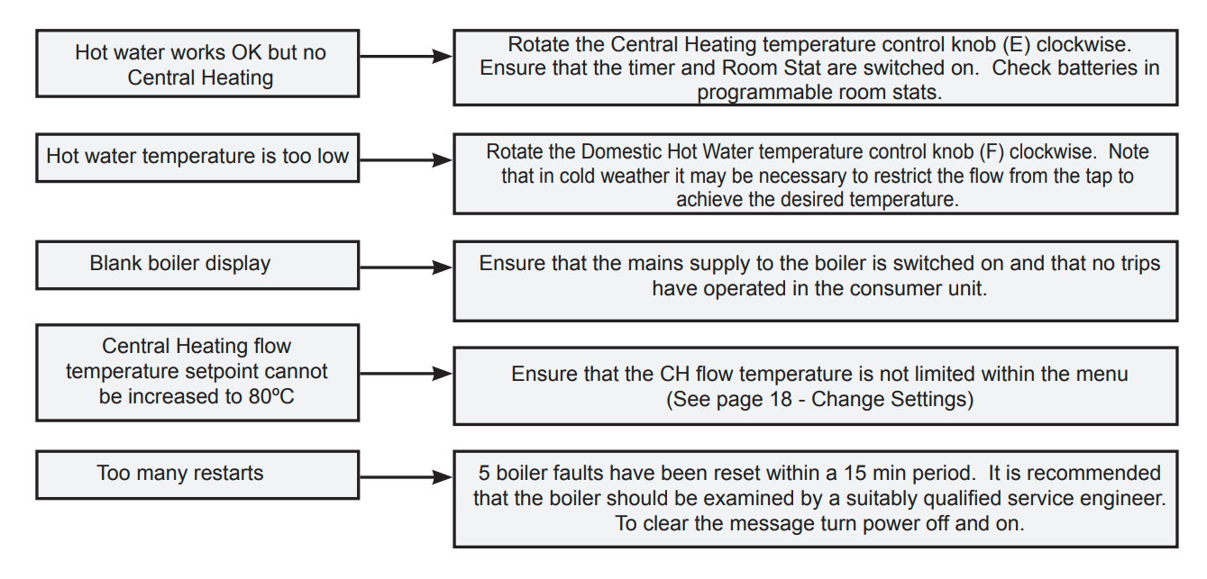 If your hot water taps are working as they should but your radiators aren’t heating up, try turning the Central Heating temperature control (E) clockwise. Another tip for resolving this issue is making sure the timer and thermostat are switched on, as well as checking whether any batteries need replacing.